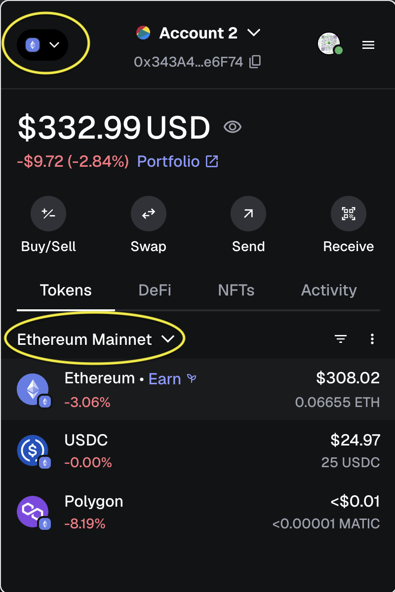 Make sure you are on the Ethereum Mainnet (circled here in yellow middle left).