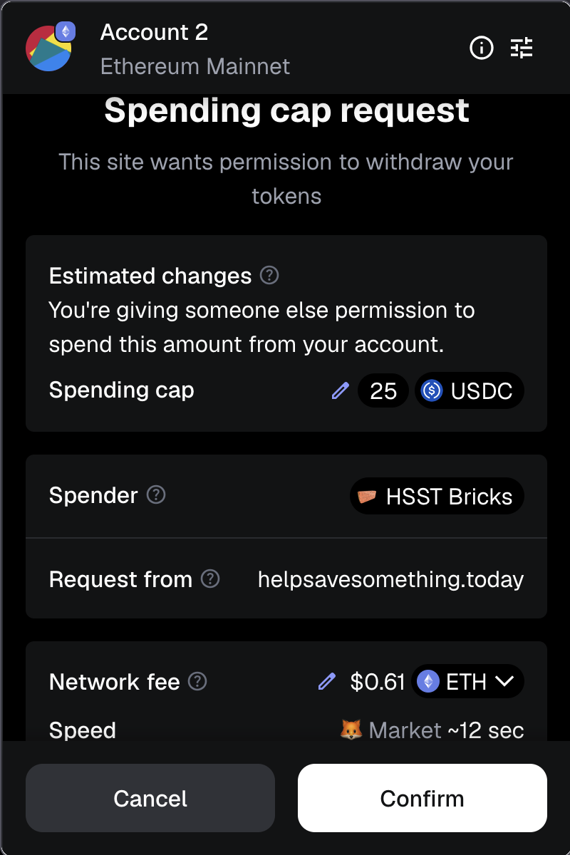 Confirm that the Spending Cap accurately matches what your HSST Bricks will cost in USDC. Check the Network Fee. Confirm that the Spender is HSST Bricks and the Request is from helpsavesomething.today.