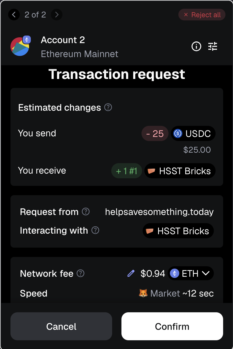 Confirm that the number of HSST Bricks you will receive is accurate. Confirm that the Transaction Request is from helpsavesomething.today and that you are Interacting with HSST Bricks.